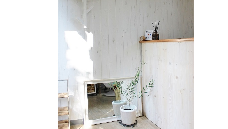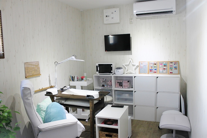 14feetの特殊サイズコンテナを使用し、ご自宅のお庭にネイルサロンを設置。 住宅街にそびえ立つホワイトコンテナがよく目立ちます。 店内はウッド調やホワイトでまとめナチュラルな内装に。 完全個室のアットホームなネイルサロンが出来上がりました。