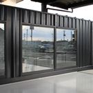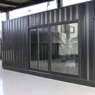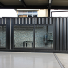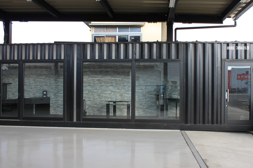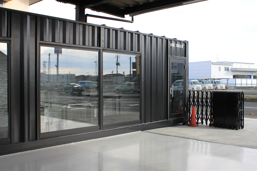 4号線沿いに突如現る存在感抜群の40フィートコンテナ。 艶のあるブラックカラーのコンテナの一面を目一杯開口し、大きな窓をいくつも設けました。内装もシックに仕上がり車販売店様にぴったりの事務所が出来上がりました。