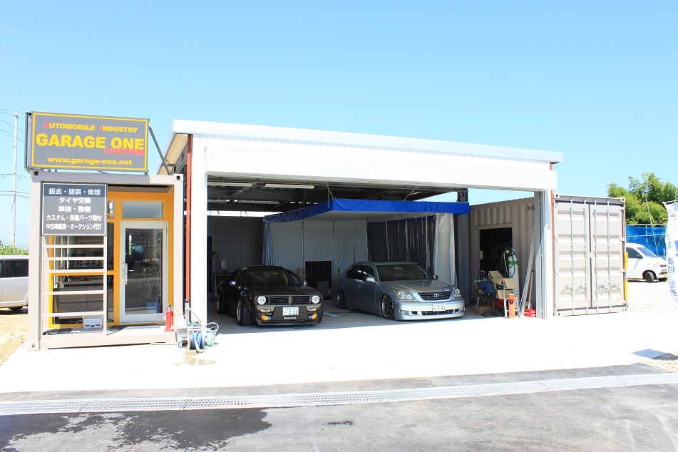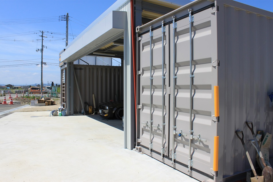 40フィートコンテナ2台+切断した特殊幅サイズ40フィートコンテナ1台に 作業場を鉄骨造で作り上げた素敵な車屋さんが完成しました。 スモーキーグレーの本体カラ―に、オフィス入口のみ黄色に塗装し、メリハリ のあるデザインに。入口分部はエントランス仕様になっております。 オフィスの他、倉庫・作業場とすべてにおいて施工させていただきました。 建築確認も取得済み。