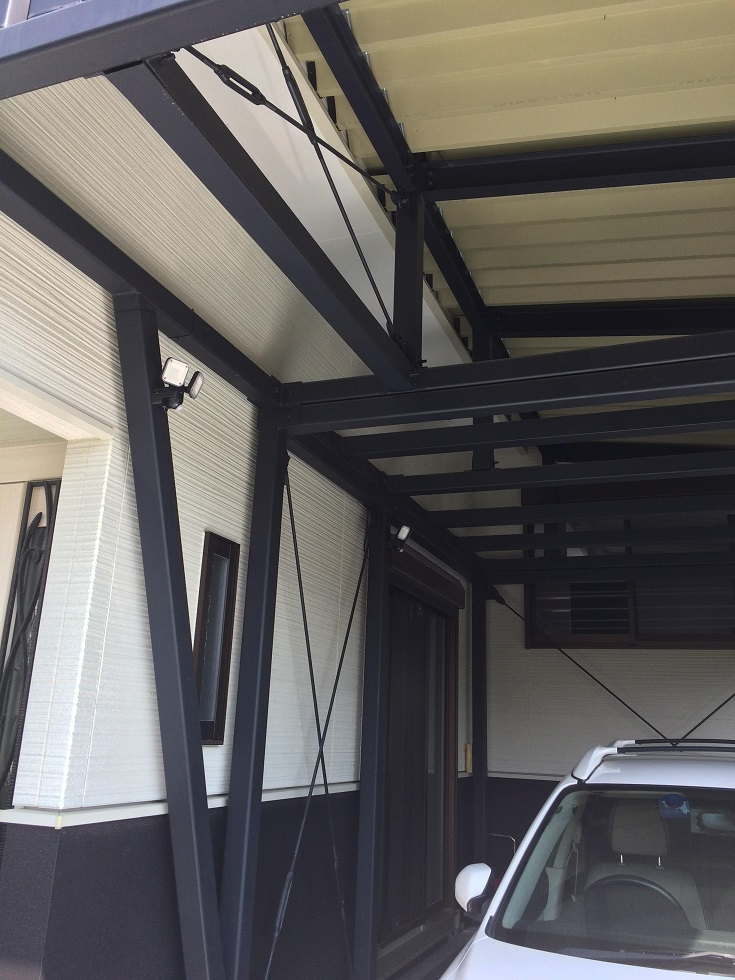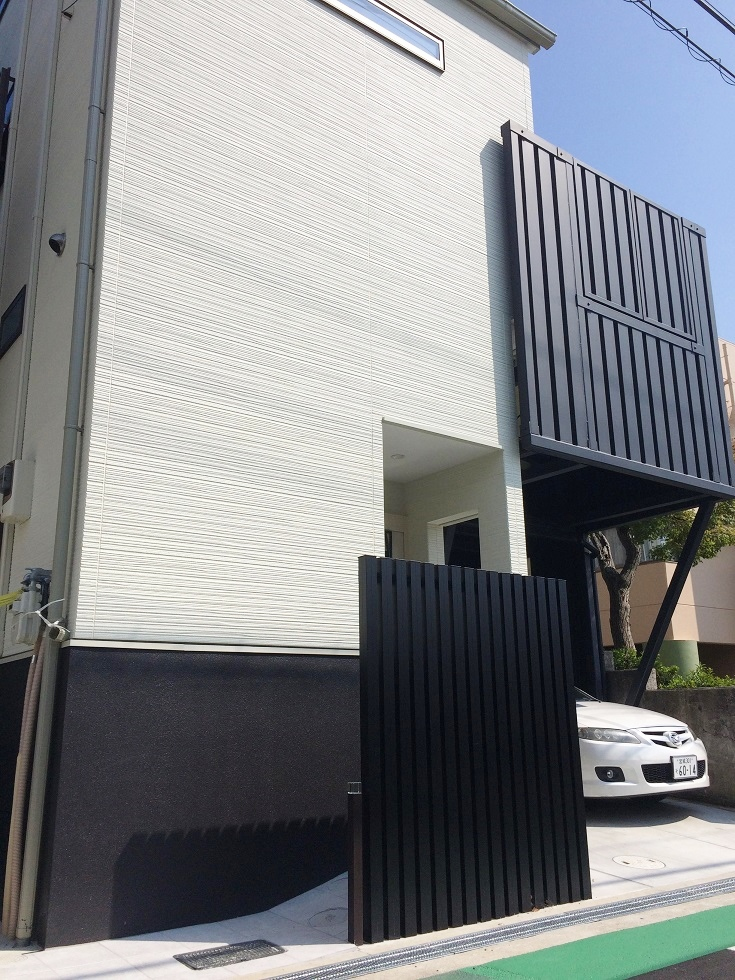 住宅設計の監修を担当させていただきました。 住宅の鉄骨でコンテナをモチーフとしたウッドデッキを制作。 下部は駐車場となっており、狭い土地でも有効活用が出来ています。 実際のコンテナと木造建築物を組み合わせる事も可能です。