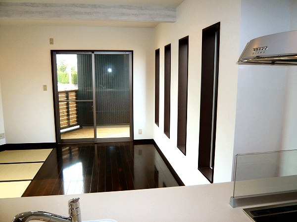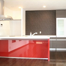 狭小地に設計した住宅。 広々としたウッドデッキを2階に設け、その下に駐車場を作ることで敷地を最大限に有効活用しています。 全体的に落ち着いたモダンなデザインですがキッチンを赤にすることでメリハリのあるオシャレなリビングとなりました。また、リビングには1.5畳ほどの畳を設け、洋室と和室が融合した遊び心のある空間となっています。