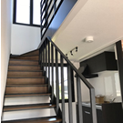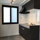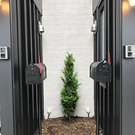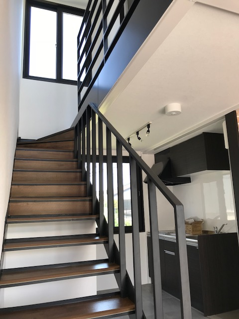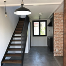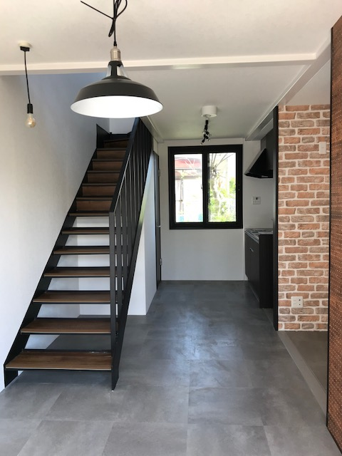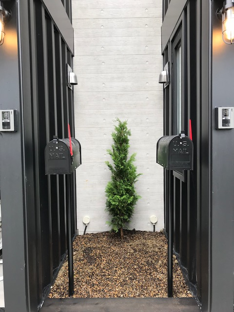 コンテナ20フィート2台を1室に×4室=計8台でメゾネット式アパートを施工。 1F部分の玄関横には電動シャッターを設け、バイクを搬入できるように設計したバイクガレージ付アパートです。1階は土間風タイルで仕上げ、2階部分は古材風のフローリングで仕上げくつろげる空間を作りました。内装もブルックリンを意識しスタイリッシュななデザイナーズアパートが出来上がりました。マットブラックカラーのコンテナによる外観は存在感抜群です。