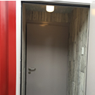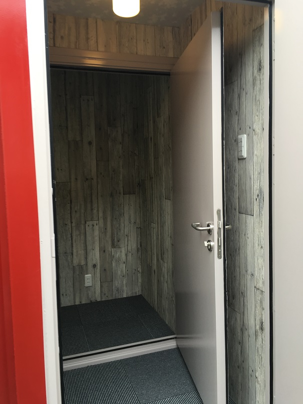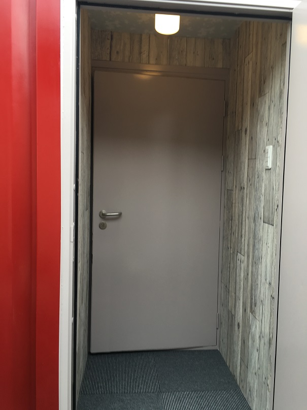 ご自宅の庭に、20フィートコンテナ1台で倉庫付き防音室を設置しました。 住宅街にそびえ立つ真っ赤なコンテナのドアは2重になっており、音楽の練習や、大音量でのシアタールームとして活用予定とのこと。 倉庫側の扉はマリンドア仕様で制作。1.5帖ほどのスペースがあるので タイヤ等の保管にも大活躍のコンテナハウスです。