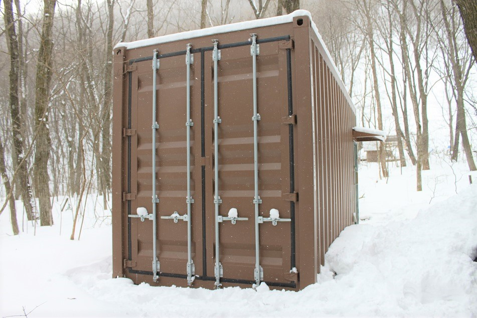 宮城県のとある別荘地。 その一角に住居を構える施主様より、敷地内にコンテナで防音室を建てたいとのご要望が。20フィートコンテナ1台を丸々防音室へと内装、マリンドアの開閉により室内に運び込まれた大きなグランドピアノが置かれました。 外側ドアは見た目重視で木製にし、裏側を防音対策で鉄製にした入口ドアと窓は2重構造、壁一面には吸音板を張り巡らせました。 マリンドアもピアノ運搬後は内側に吸音板による壁で塞ぎ、防音性はバッチリです。