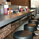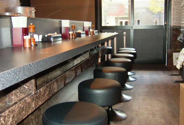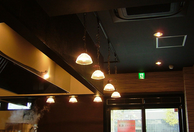 今回は3号店であり、1号店・2号店の雰囲気と違い、外観は赤と黒を基調、内装は黒と茶を基調とし、カウンターの照明はアンティーク調のペンダントを用いるなど、モダンな造りとなっております。